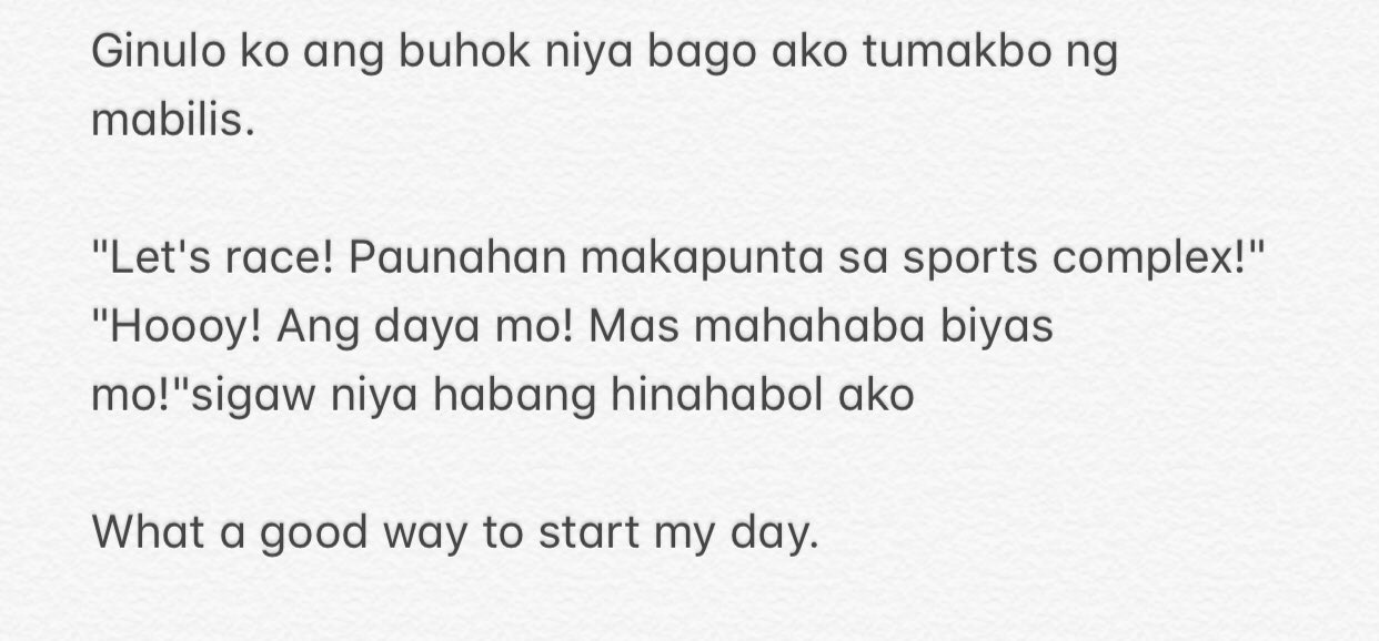 Dahil sabi niya mahirap habulin pag naroon na sa malayo Paulit-ulit ito sa isip ko at natakot ako Kaya itinali ko nang mahigpit sa kamay ko Hindi na ito mawawala panigurado Manhid na ang kamay ko sa higpit pero Mahirap habulin pag naroon na sa malayo Tumakbo ako nang tumakbo masaya walang pag-aalala. KABANATA 2 Isang Liham Mula sa Maibiging Diyos. Kailangan mo na ng mata sa likod dahil mabilis ang mga paa at kamay ni baby ngayonmaliksi at mahirap pa ngang habulin minsan.
